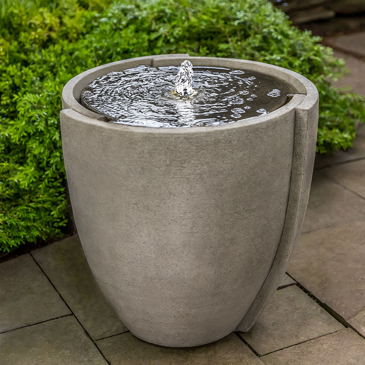 A freestanding floor water fountain with an elegant, modern design. The sides of the Concept Basin Fountain have an overlapping appearance for a unique look. The top of the has a disk for water to flow over to create a sparkling, shimmering water feature in your outdoor decor. This small water feature is the perfect size for a backyard patio or to place as an accent in your landscape border. Recirculating. Pump included.