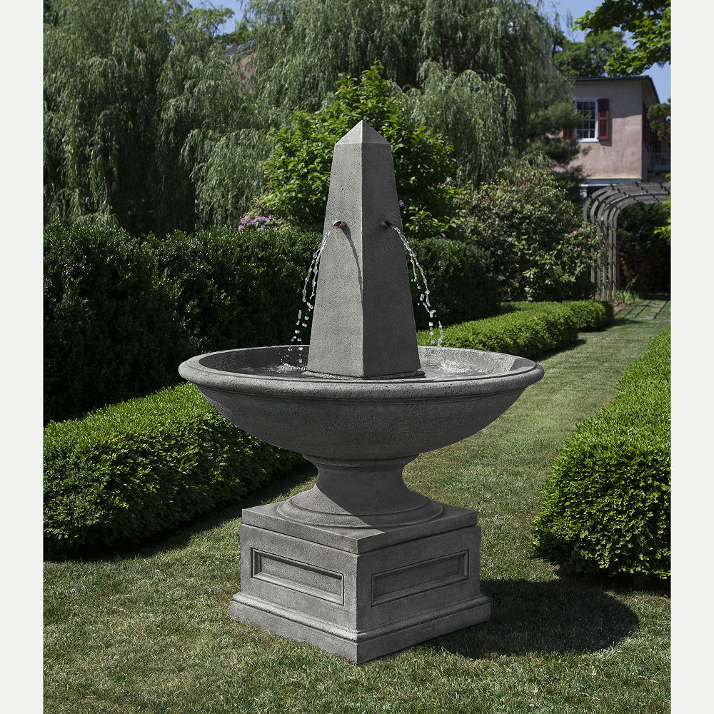 A regal, deep bowl outdoor water feature with a handsome obelisk rising from the center, the Condotti Obelisk Fountain is a garden accent to make a bold statement in an open space or front yard. The inspiration is old world Italian with a Roman flair but the design has been updated to suit modern tastes. Clean and done with simple elegance in mind the fountain has a dramatic, imposing rectangular cross section and a pyramidal top obelisk where the water falls from spouts located slightly down the sides of the pyramid. The free standing Condotti Obelisk Fountain is a best pick for a formal area to add class and sophistication and would be ideal for a commercial place of business or home placement. For sale as a water feature without the obelisk. Pump included. Lead Time: 10 Days.