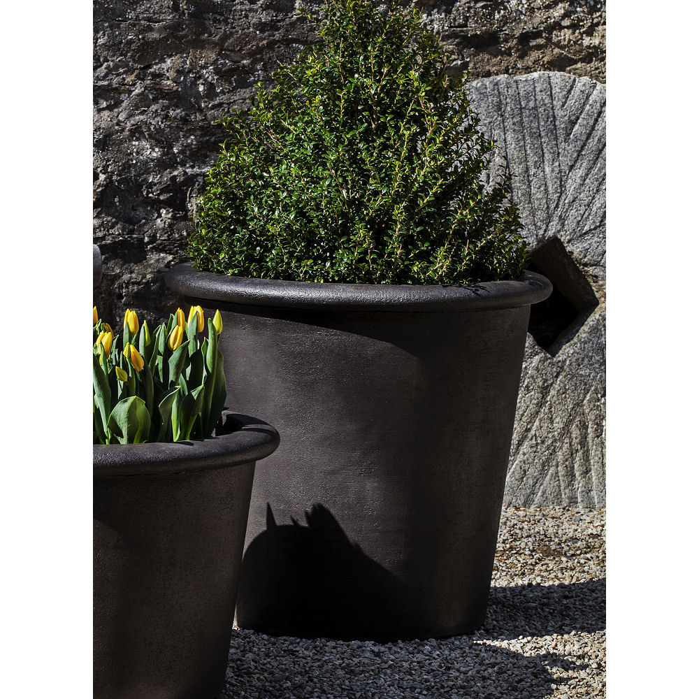 A handsome, large capacity outdoor plant pot with a smooth, elegant form. The Palo Alto Planter Tall has a large interior and tall, narrow form for courtyard or backyard patio container gardens. It would also be an outstanding idea for setting alongside a tall, empty wall. The large size permits you to use this vessel as a flower pot for bold displays of color or as a small tree planter for a specimen or accent plant. The Palo Alto Planter Tall has southwestern flavor paired with contemporary design for a bold look in your outdoor decor. Match with the Low Palo Alto Planter and Mill Valley Planter. Concrete cement, residential or commercial. Has drain hole. Lead Time: 10 Days.