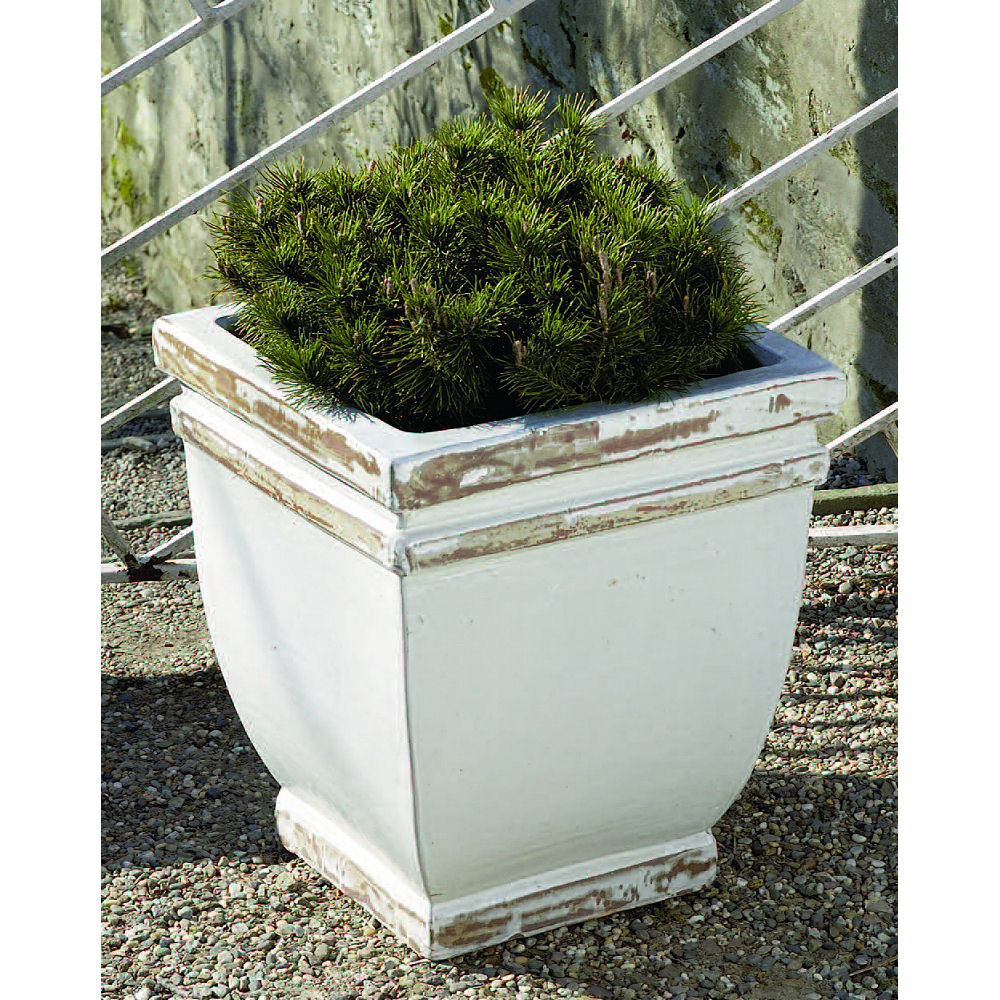 A beautiful plant pot with a distressed look glaze. The indoor or outdoor Square Rolled Rim Antique White Planter has a versatile style which can be contemporary casual chic, country farmhouse, French provincial or more. While they have an old fashioned vintage appeal, the design is timeless and transitional and always fashionable. The Square Rolled Rim Antique White Planters have a chic antique white glaze with a rubbed look to allow the natural terra cotta pottery to show thorough. The result is understated and charming yet catches the eye. The square shaped form features a double rolled rim at the top for a touch of style.