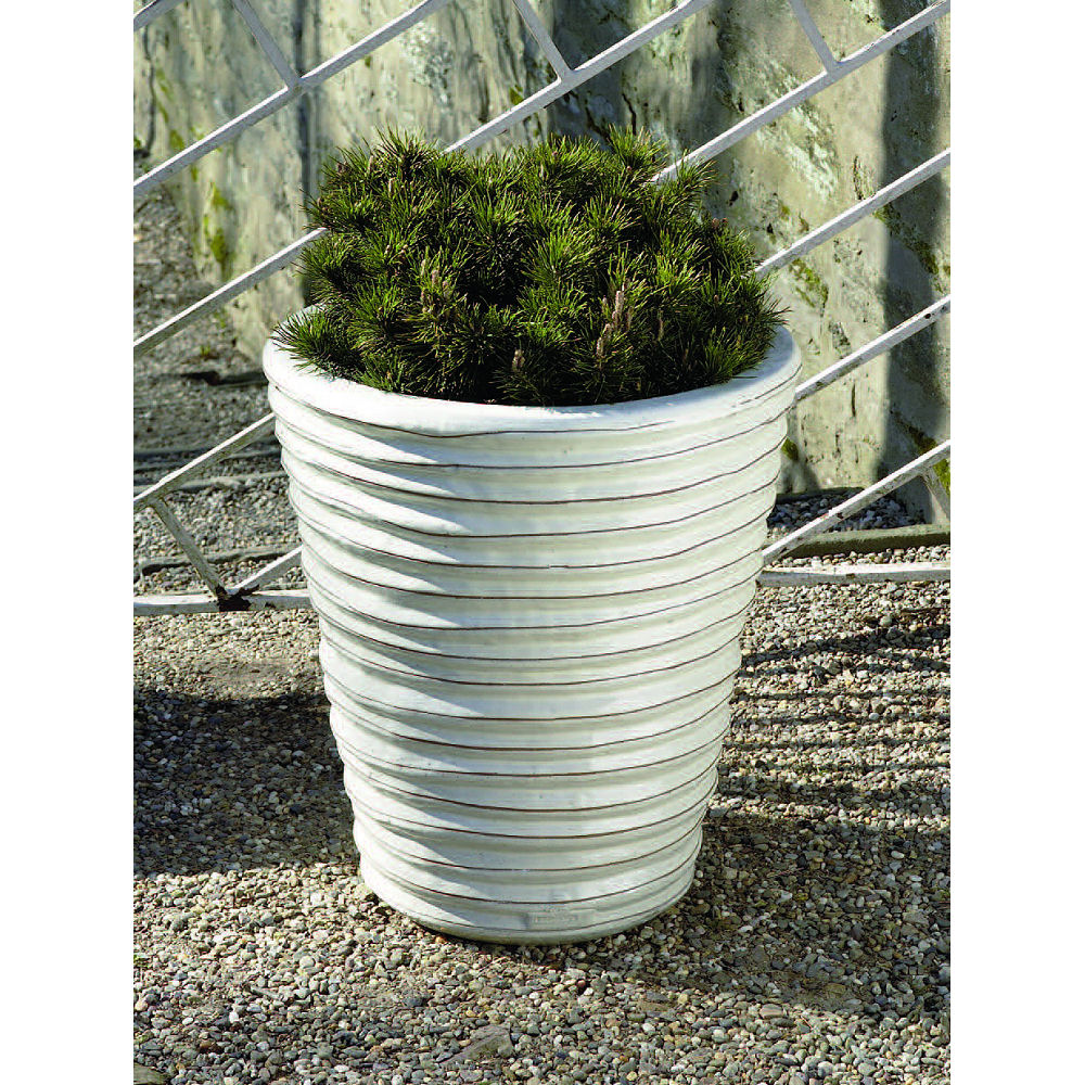 Gentle flower pots with an aged, distressed look to the finish and transitional design. The Round Ruffle Planter Antique White is made of glazed pottery in a spiral pattern which circles the vessel. The white glaze is applied by hand with some of the terra cotta allowed to show through for an old fashioned look. These flower pots have a transitional style and will blend well in a contemporary or informal, rustic garden. The Round Ruffle Planters Antique White would be lovely in a mixed pot container garden for your French country or farmhouse setting but are adaptable to modern decor schemes as well. Match with other vintage Antique White planters to coordinate your outdoor style. Indoor or outdoor.