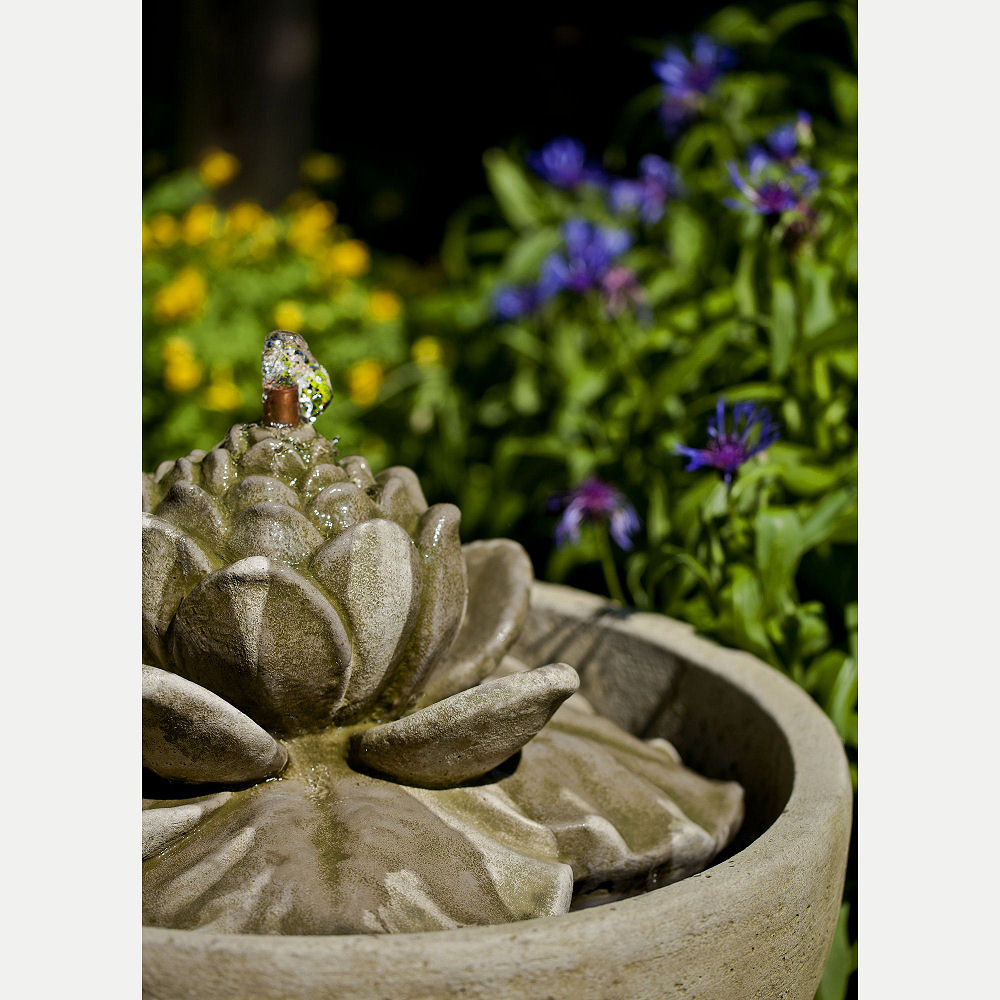 A simply gorgeous water fountain with a small footprint suitable for small space gardens or patios. The Smithsonian Lotus Fountain features a dimensional lotus flower rising from a bowl. Water falls gently down the blossom petals and into the basin. The base rests on a short pedestal for visual interest and to lift it slightly off the ground. The Smithsonian Lotus Fountain water feature has a versatile design which can work in a casual contemporary, old world formal, traditional or even Japanese garden. Wherever you choose to place it the Smithsonian Lotus Fountain will provided a show stopping, artistic accent. Floor, recirculating, free standing. Pump included. Lead Time: 10 Days.