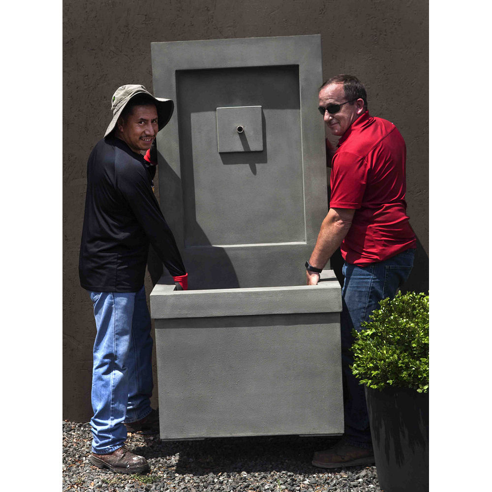 If you want the look if stone without the heavy weight this outdoor wall free standing water feature may be a best pick. The Brentwood Fountain is made of lightweight Glass Fiber Reinforced Concrete (GFRC) and for sale in an array of finish colors, the Brentwood Wall Fountain is easy to move and place. It has a stylish modern look suitable for the transitional home with smooth, clean lines and a raised, square centerpiece with a spigot the water flows from. Bring the calming element and melodious sound of falling water to your outdoor entertaining area with the Brentwood Fountain and relax with guests as you enjoy nature. Floor standing. Campania. Note: For GFRC Products the Natural color choice will be WHITE, not concrete. Pump included. Lead Time: 10 Days.